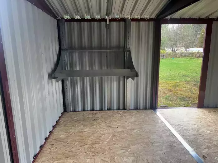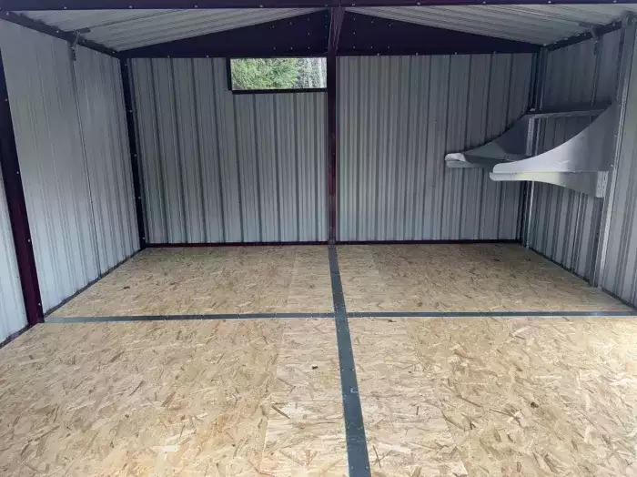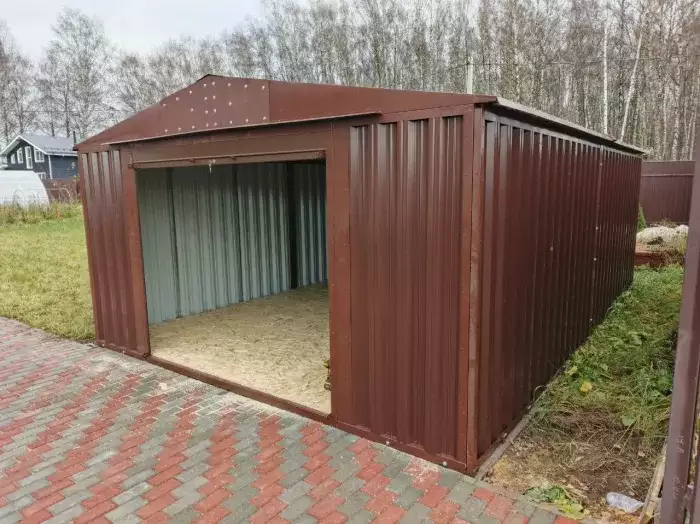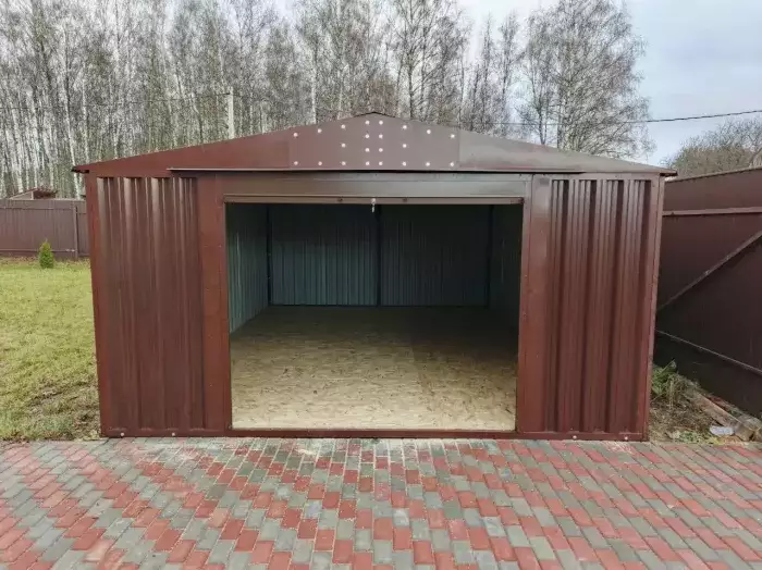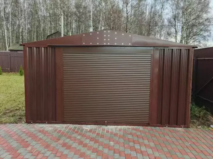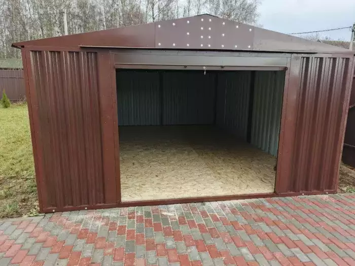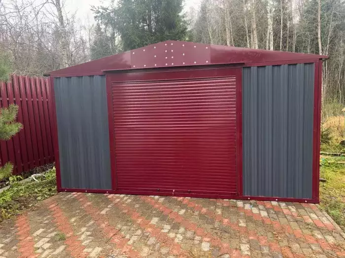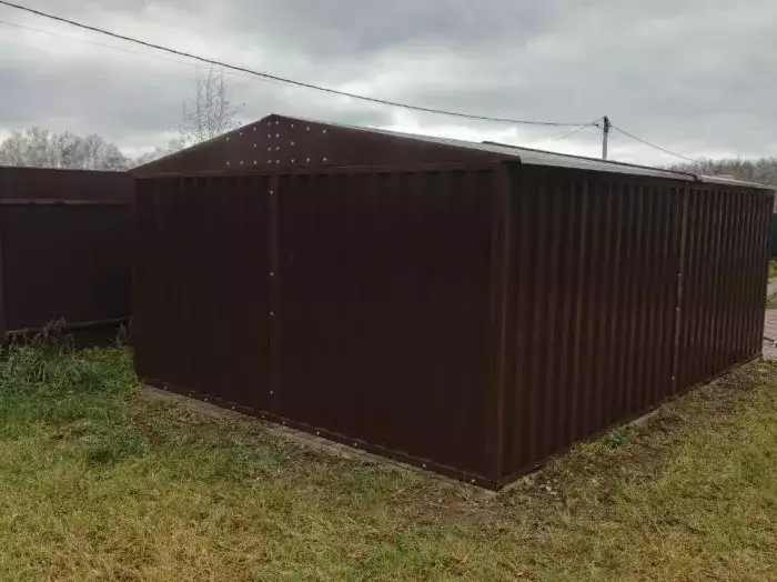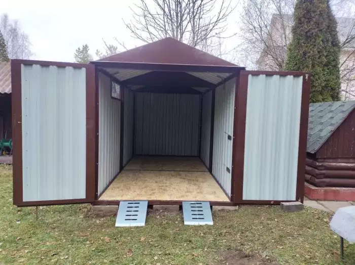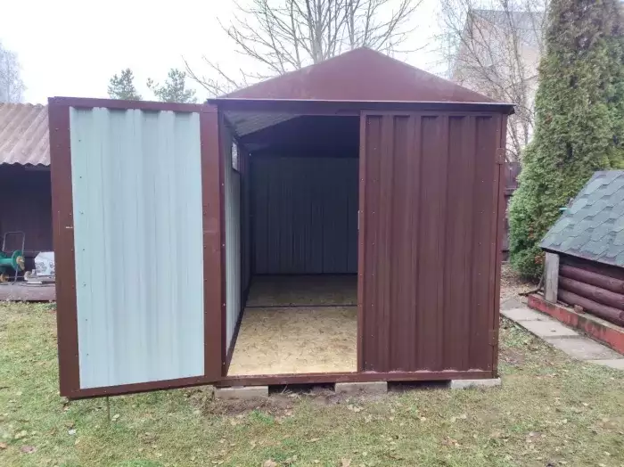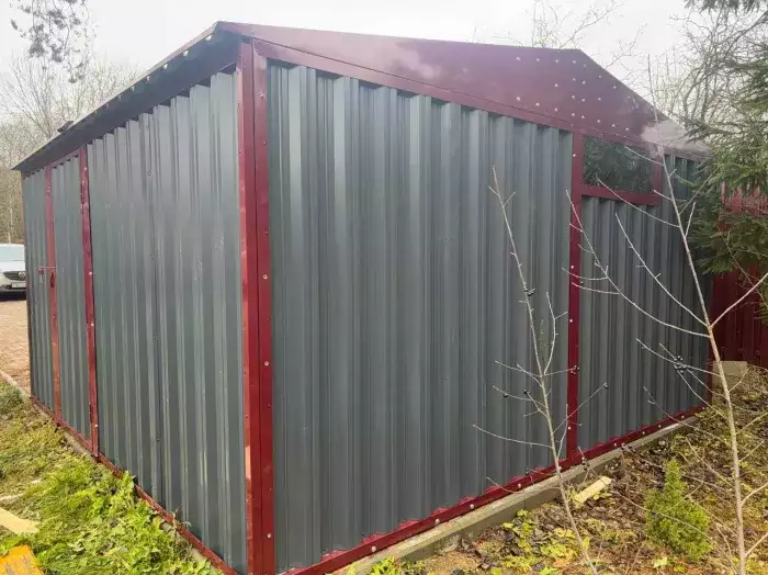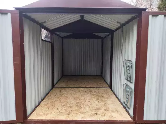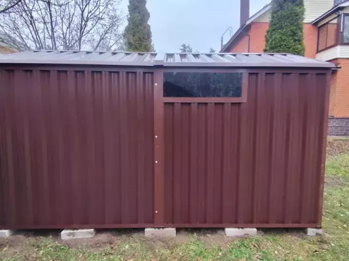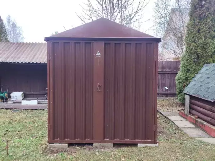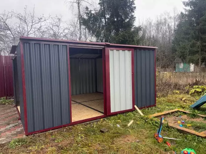 Нами были изготовлены две конструкции размером 3,78 х 2 х 2,06 м и 4,85 х 2 х 2,06 м с плоскими крышами в строгом графитовом цвете RAL 7024. Этот цвет был выбран в тон предыдущего проекта. Распашные ворота в хозблоках не понадобились, по желанию заказчика на обоих постройках сделали дверной проем.