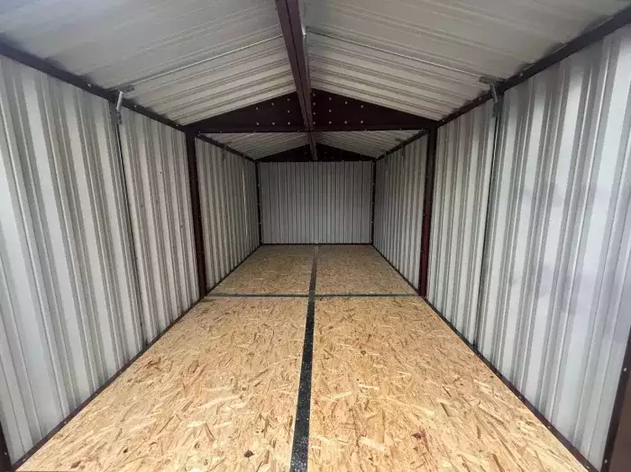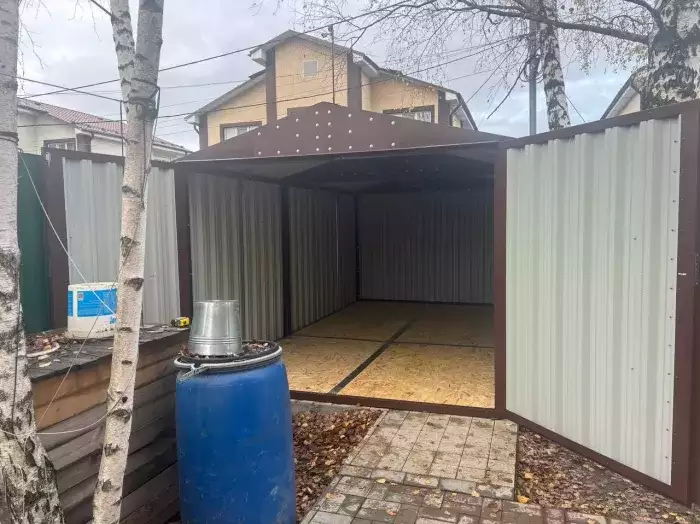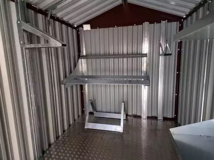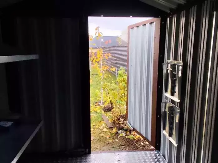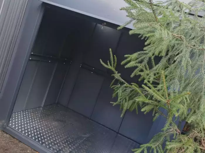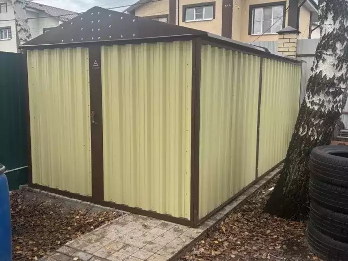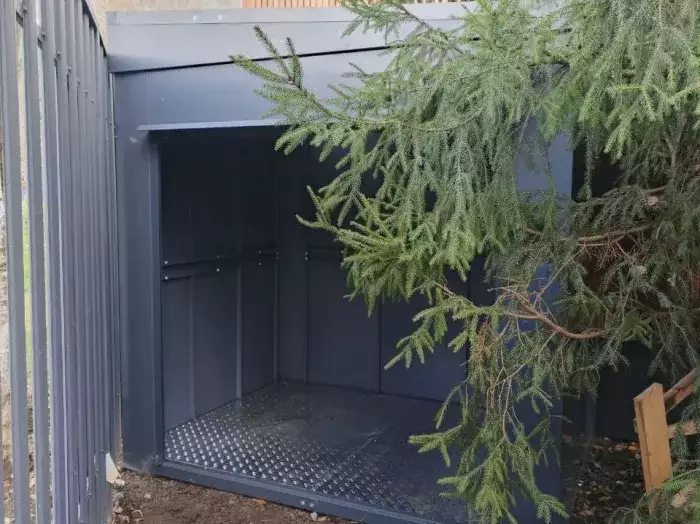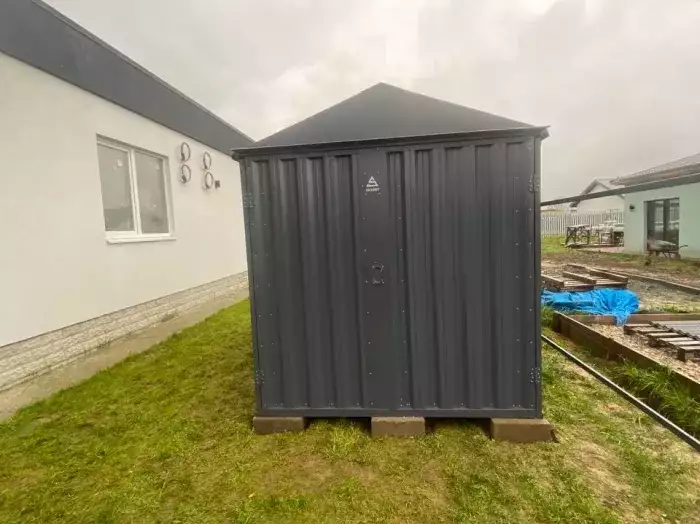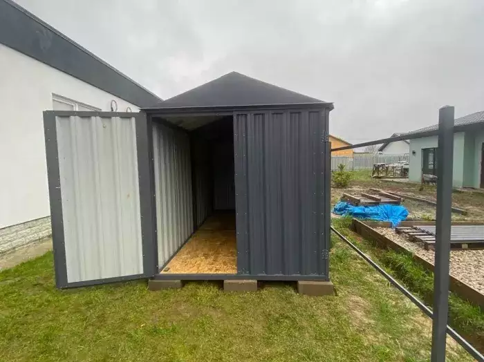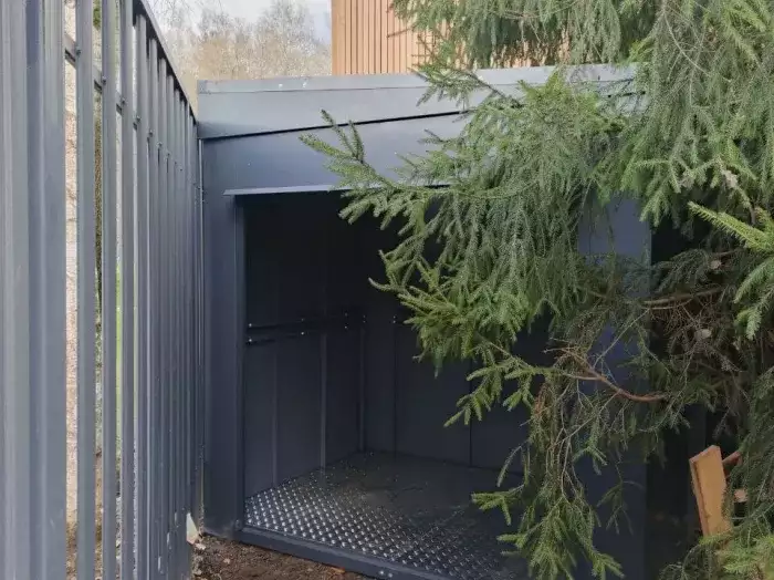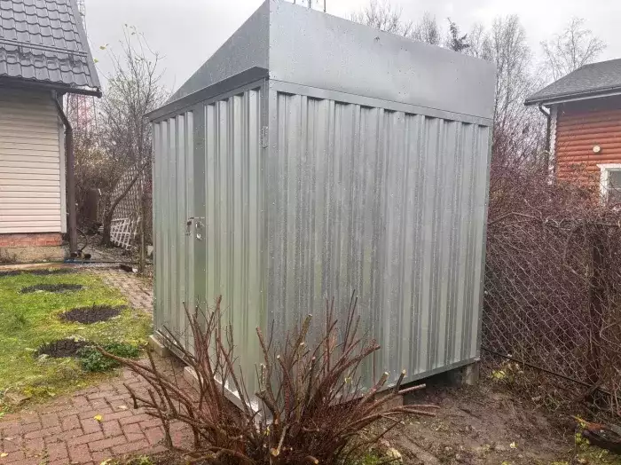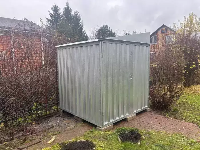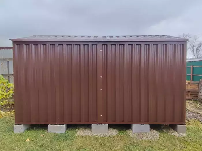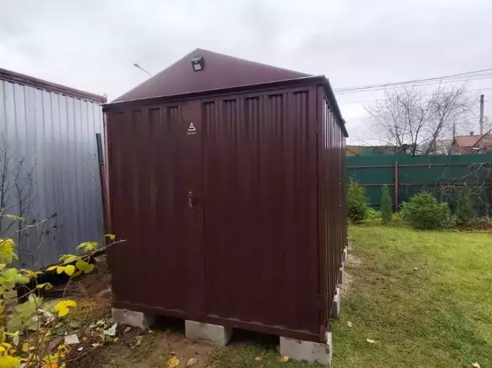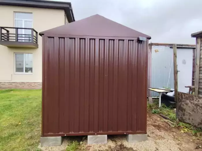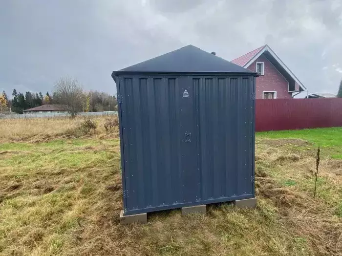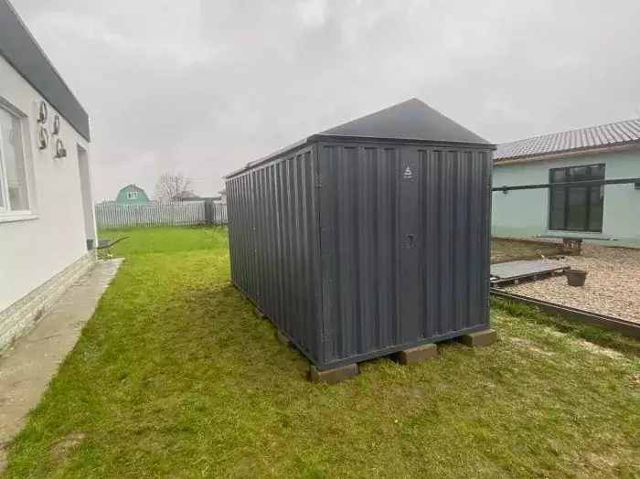 Проект: два 2-метровых хозблока для хранения садового инвентаря и хозяйственных вещей в серо-коричневом цвете.