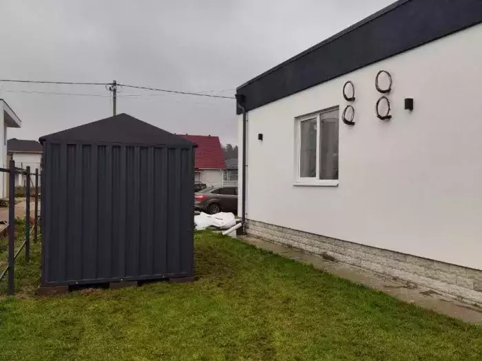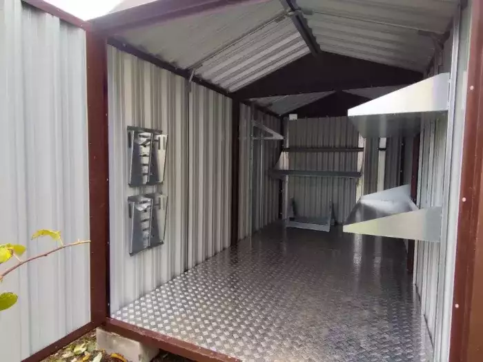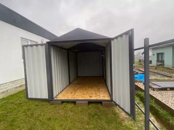 Нами были изготовлены две стандартные 2-метровые конструкции с двускатными крышами и торцевыми входными группами с рольставнями в благородном серо-коричневом цвете RAL 8019.