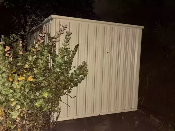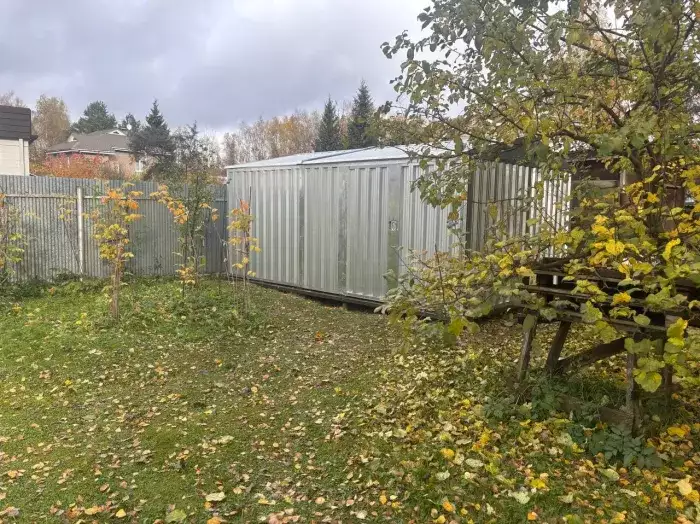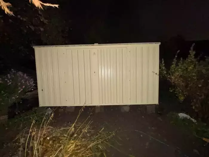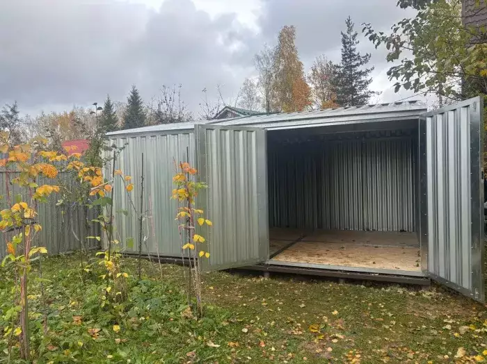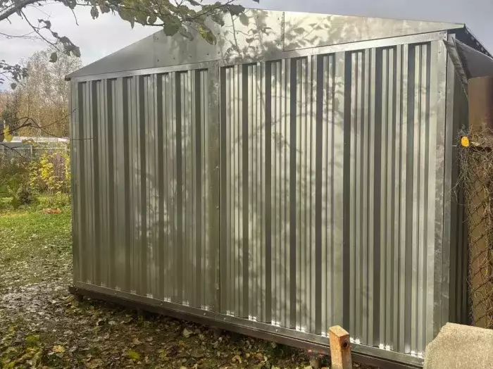 По итогу, выбор пал на 4-х метровый контейнер с плоской крышей и рольставнями в оттенке RAL7024 (под цвет своего забора). Как показали фотографии – хозблок вписался идеально!