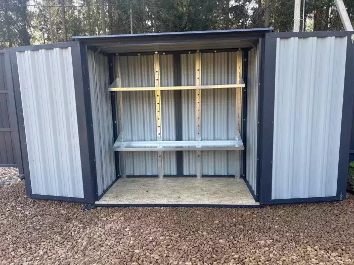 Дополнительно хозблок оборудован двумя световыми окнами по торцевым сторонам изделия, прямым стеллажом с тремя полками, а также пандусами для комфортного въезда техники.