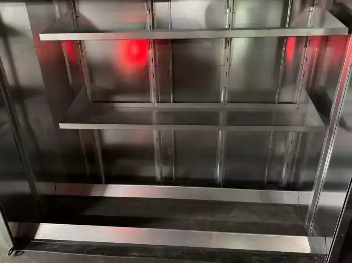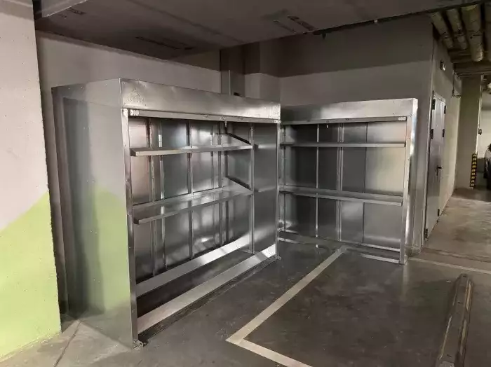 Цветовое решение постройки подбирали под цвет забора и остановили свой выбор на цвете 9005 по каталогу RAL (чёрный янтарь). Также, по желанию заказчика, хозблок был дополнен системами хранения. Теперь у хозяина участка каждая вещь будет иметь свое место.