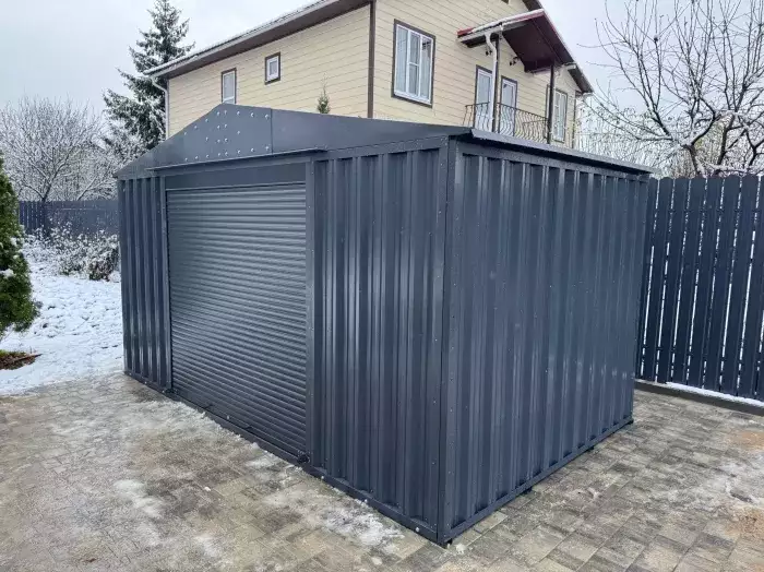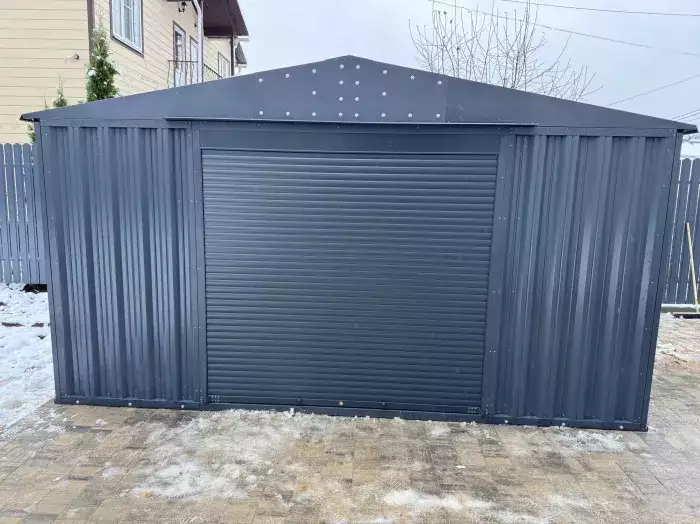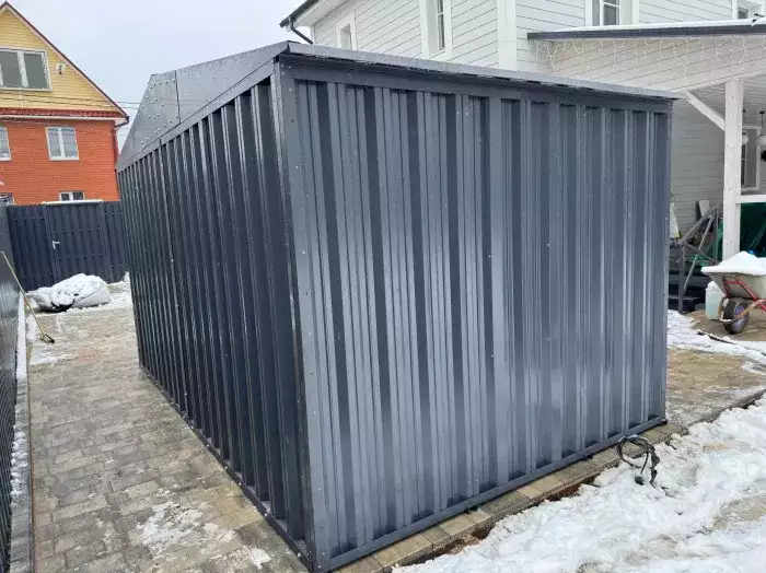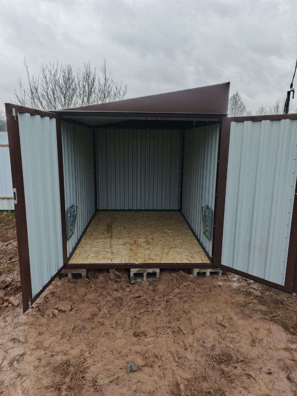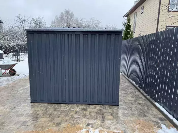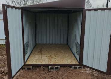 Нами была изготовлена стандартная 3-метровая конструкция с односкатной крышей и торцевой воротной группой в неизменно популярном шоколадно-коричневом цвете RAL 8017.