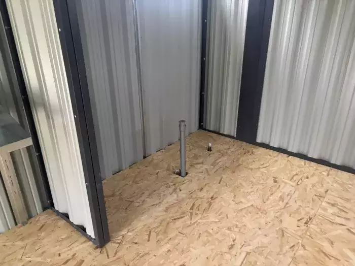 Нами была изготовлена 6-метровая конструкция с односкатной крышей и боковыми воротами. Окрас постройки был выбран в цвете Наив Марун, а для экономии, заднюю часть хозблока оставили в цвете RAL 8017.