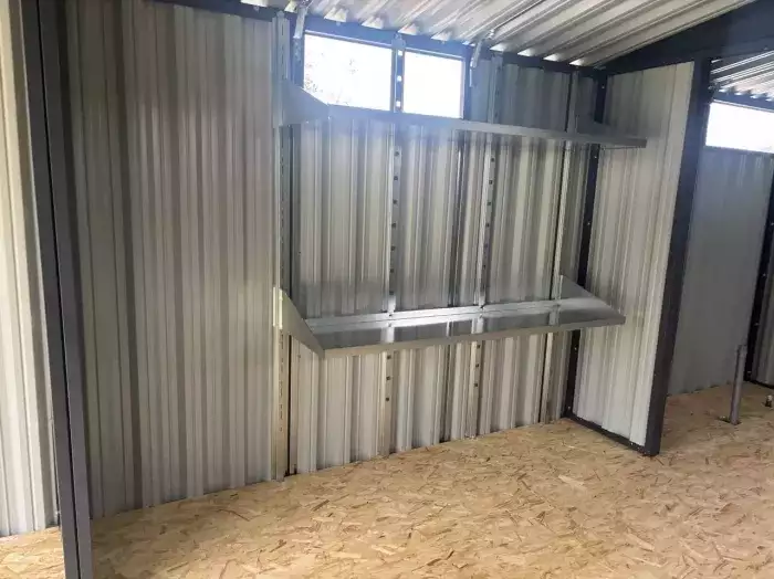 Также, по желанию заказчика, хозблок был дополнен инструментальной панелью, пандусами и антивандальным засовом. Теперь у хозяина участка все вещи будут иметь свое место, а надежный помощник будет бережно и ответственно их хранить.