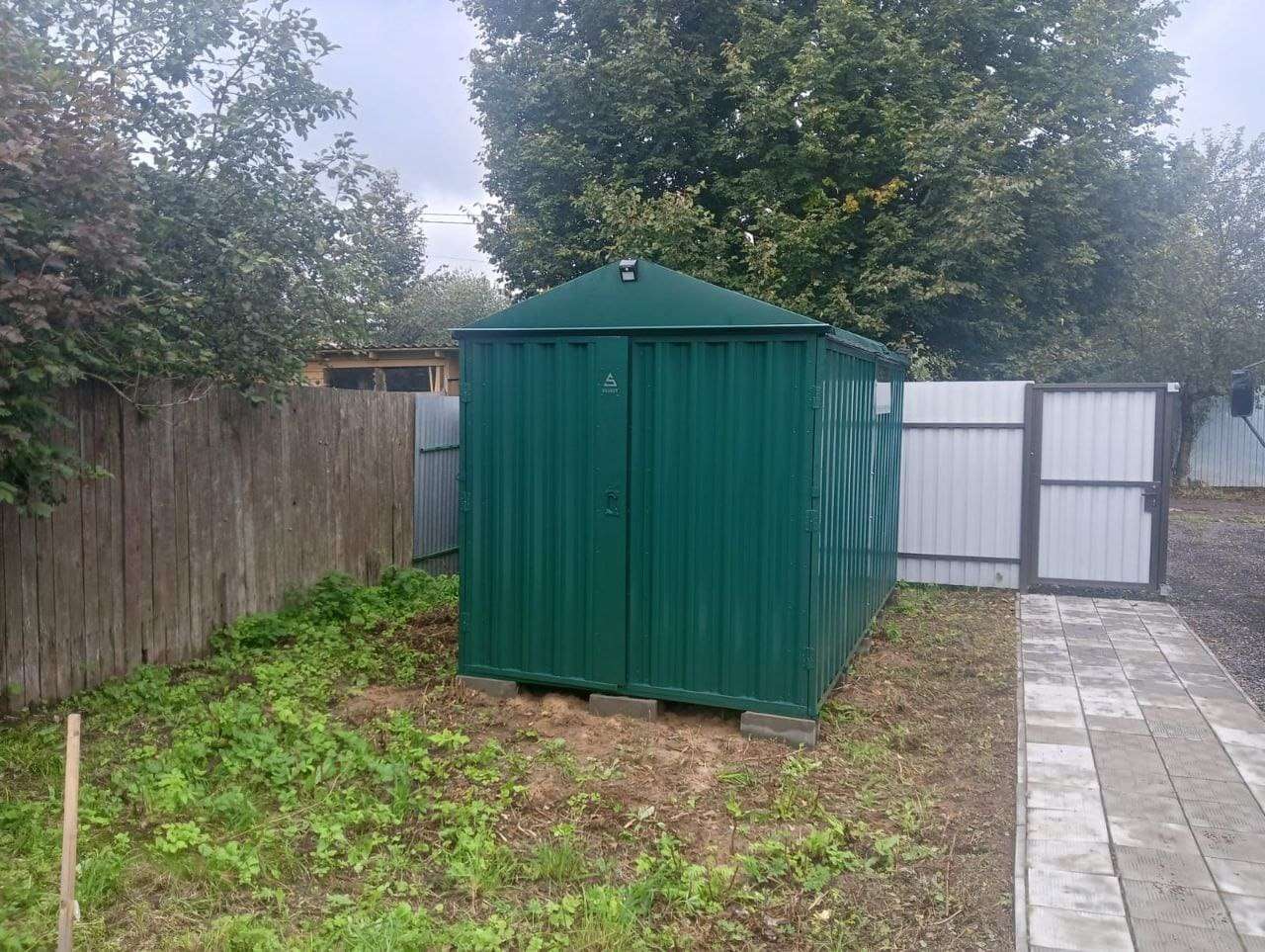 Проект: 4-метровый хозблок для хранения садовой техники и инвентаря в зеленом цвете.