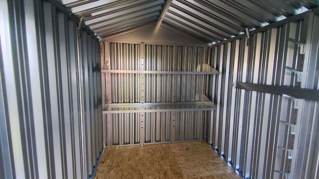 Дополнительно хозблок оборудован прямым стеллажом с двумя полками, системой хранения инвентаря, антивандальным засовом и пандусами для комфортного въезда техники.