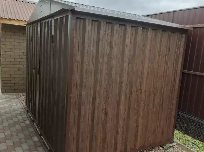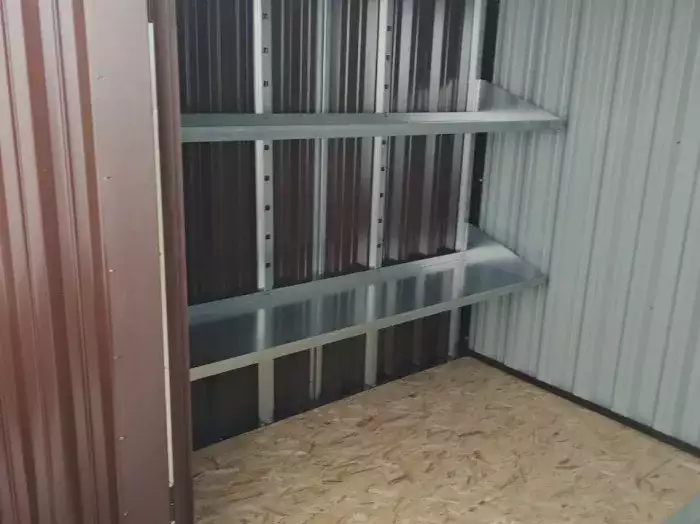 Проект: хозблок индивидуальных размеров с тремя секциями для хранения велосипедов, автомобильных колес и хозяйственных принадлежностей в цинковом цвете.