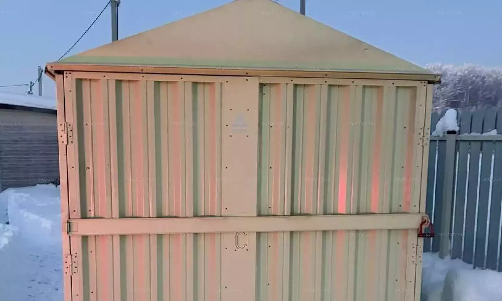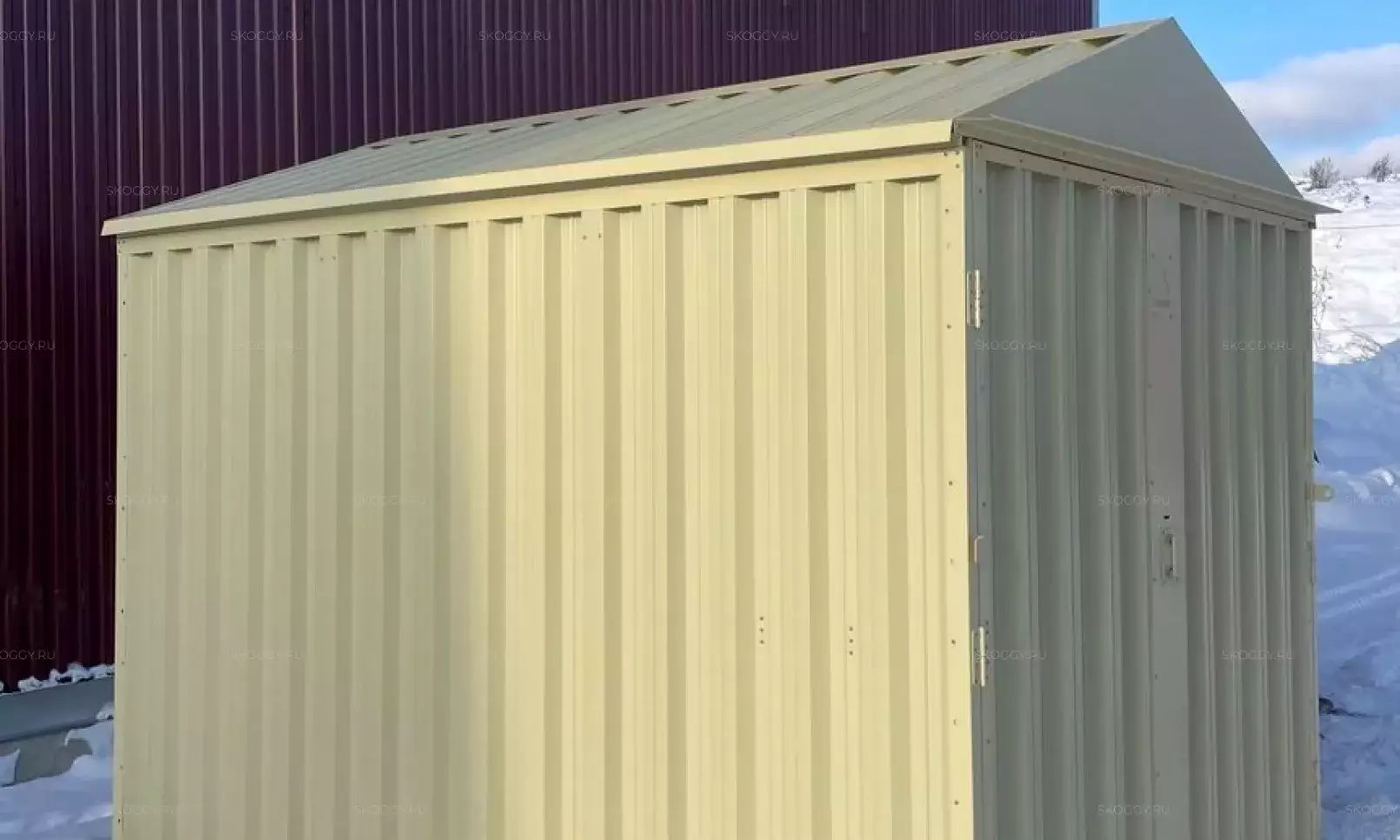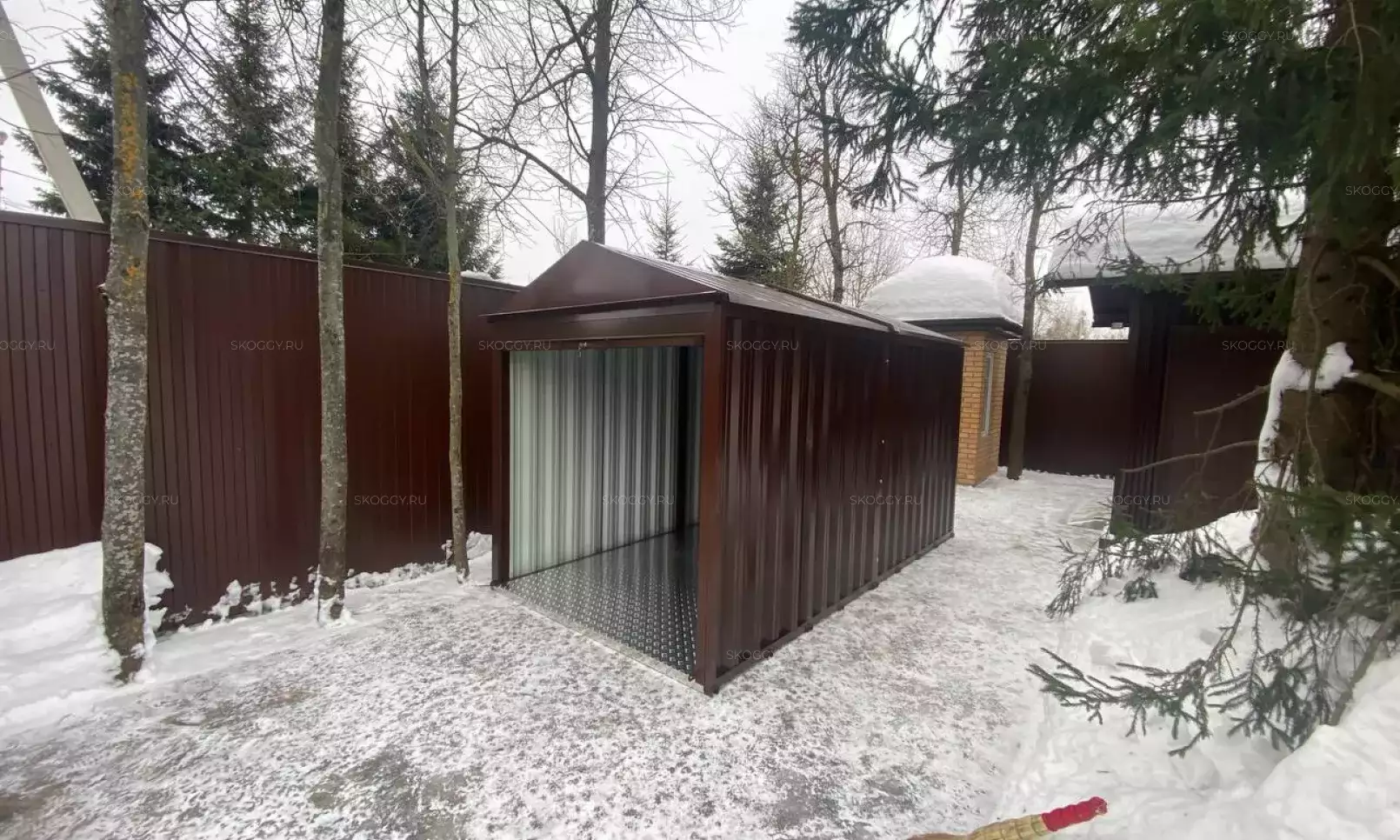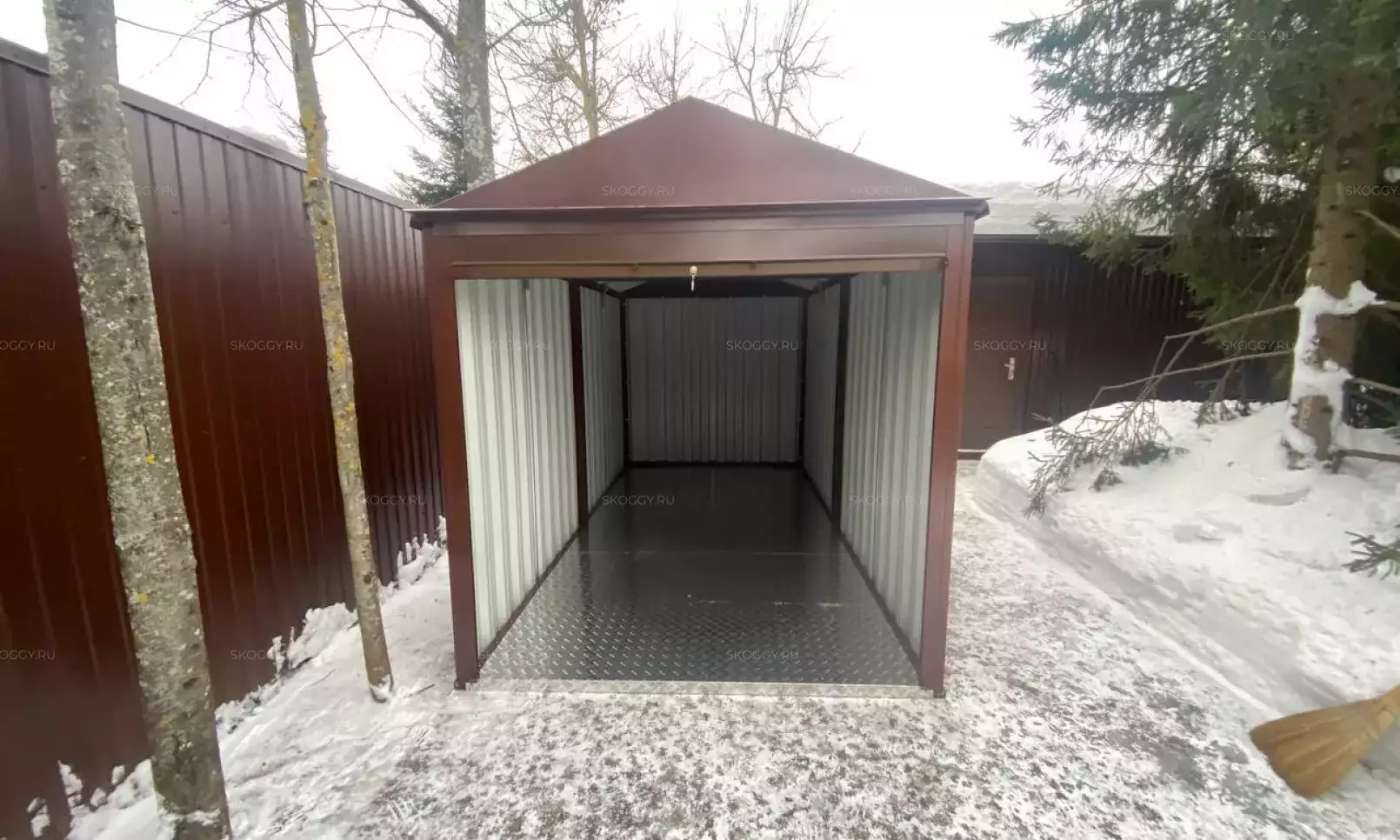 Нами была изготовлена стандартная 3-метровая конструкция с увеличенной высотой 2,8 м с двускатной крышей и торцевой воротной группой в стильном шоколадно-коричневом цвете RAL 8017.
