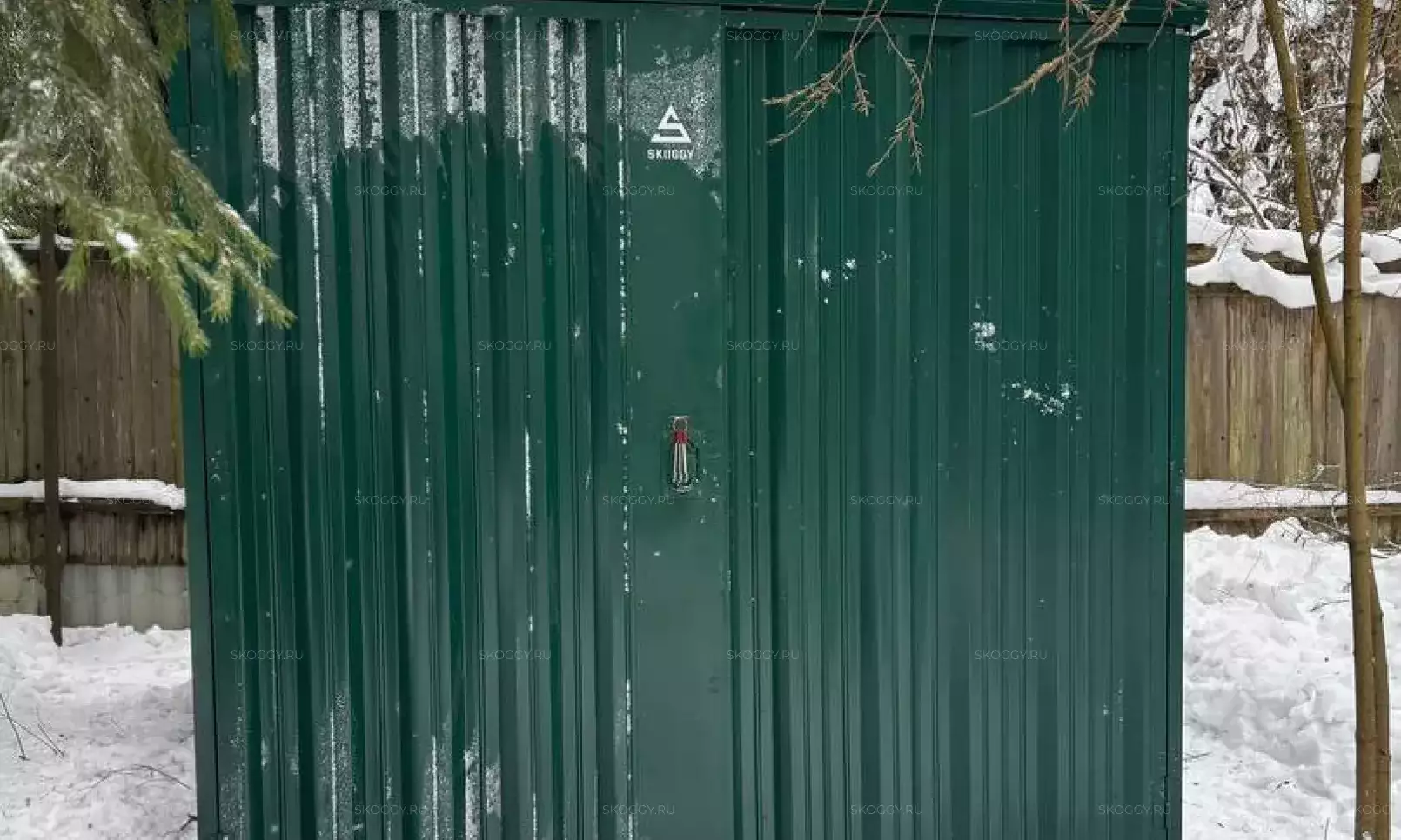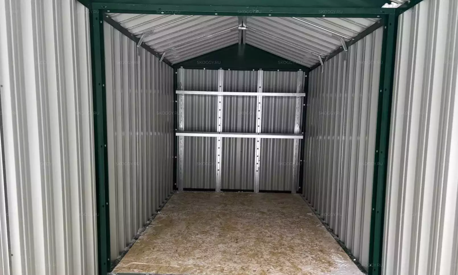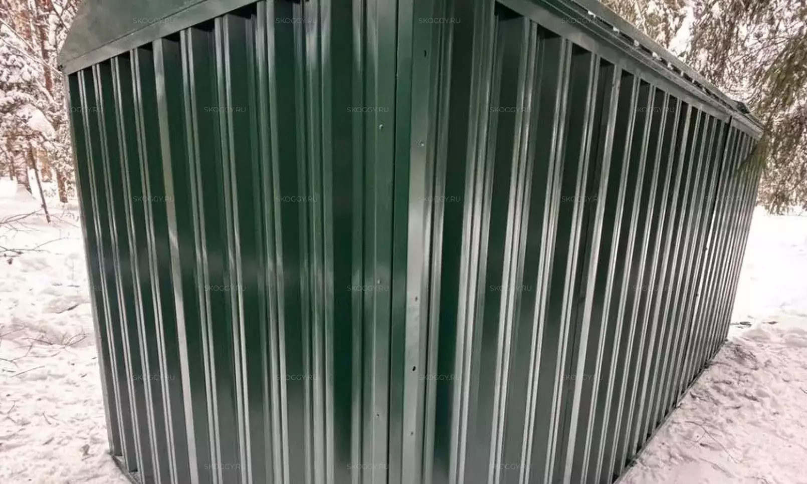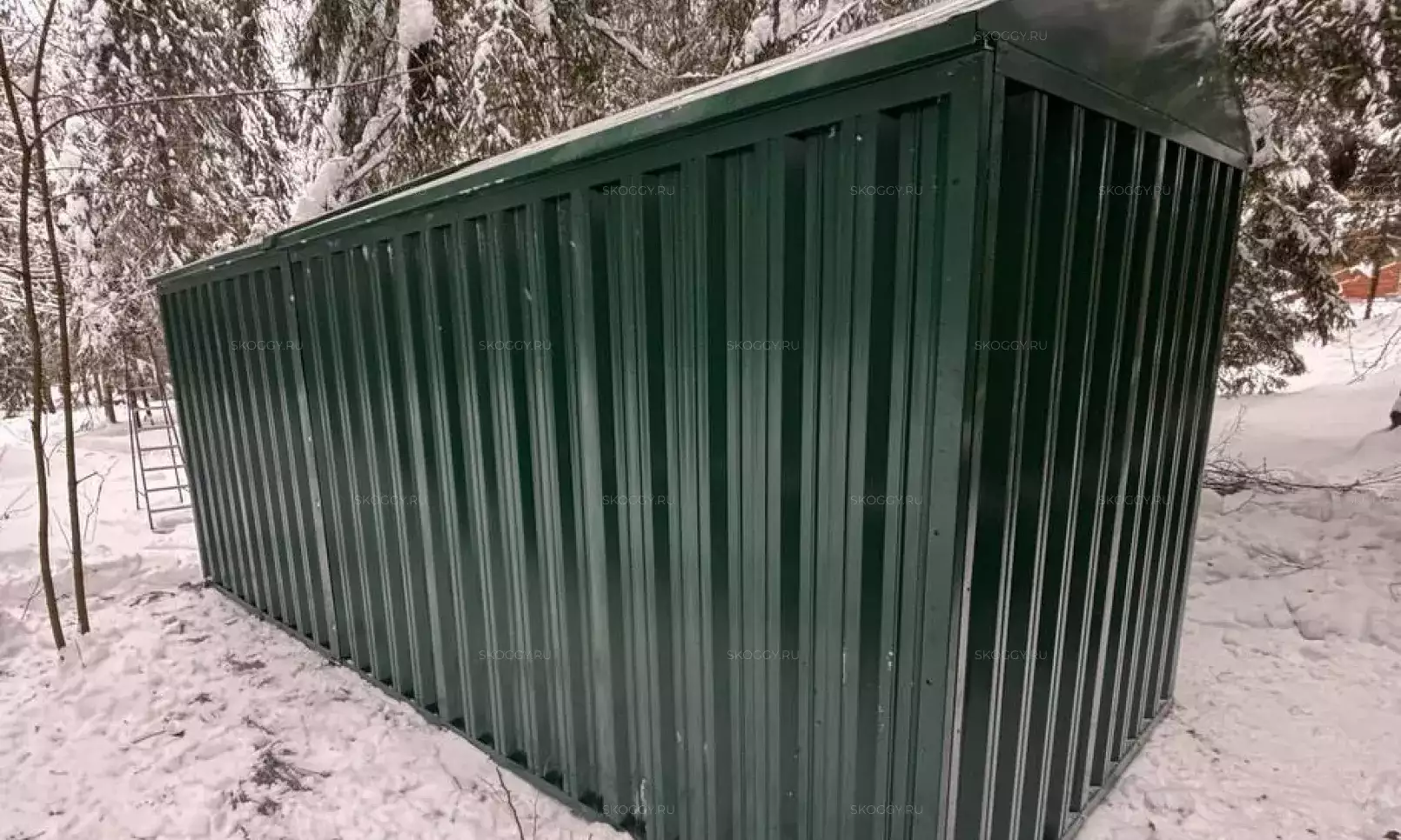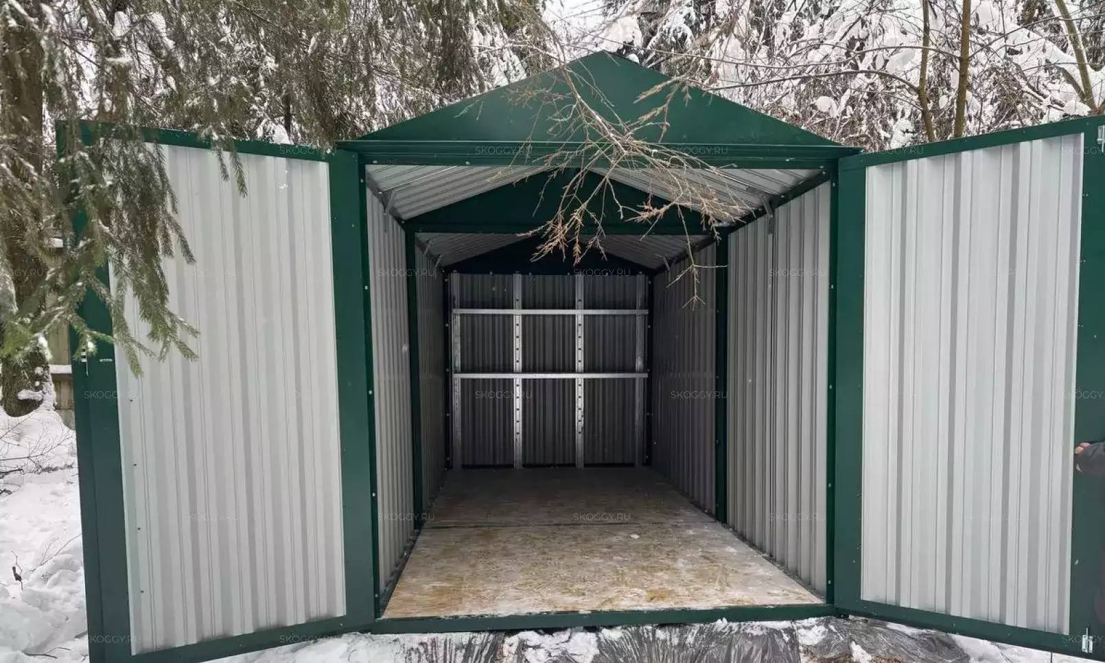Нами была изготовлена стандартная 3-метровая конструкция с увеличенной высотой 2,8 м с двускатной крышей и торцевой воротной группой в стильном шоколадно-коричневом цвете RAL 8017.