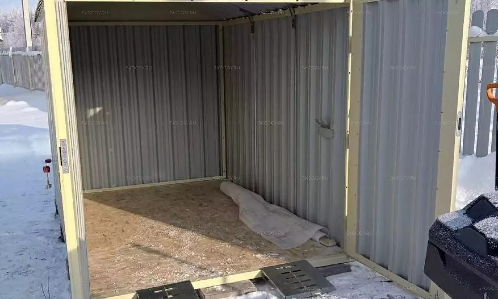 Доставляли гараж на территорию заказчика манипулятором в разобранном виде.